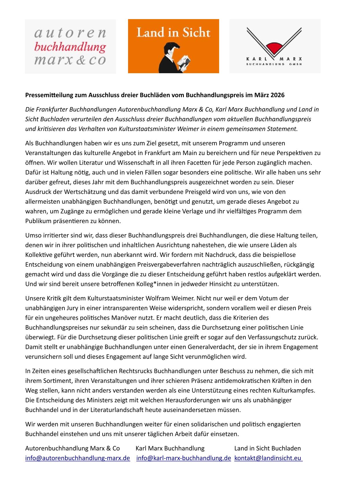 Die Frankfurter Buchhandlungen Autorenbuchhandlung Marx & Co, Karl Marx Buchhandlung und Land in Sicht Buchladen verurteilen den Ausschluss dreier Buchhandlungen vom aktuellen Buchhandlungspreis und kritisieren das Verhalten von Kulturstaatsminister Weimer in einem gemeinsamen Statement.